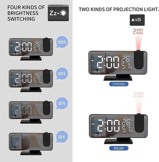 180° Projection Alarm Clocks for Bedrooms Perfect projecting alarm clocks for bedrooms ceiling, this 180° rotatable projection clocks with focus control ring projected a clear time on your wall. Whenever you wake up, the time comes into your eyes. And our projector alarm clock for bedroom equipped with a high sensitivity sensor which can adjust the display brightness, it will not disturb you or your kids sleeping.