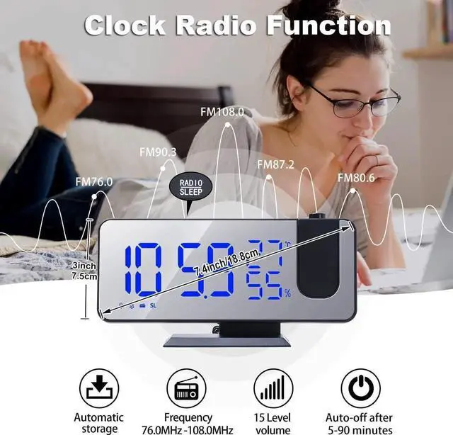 Radio Function with Sleep Time or Wake TimeClock radio can searching, locking, and storing unlimited number stations within 76-108 MHz. Auto-off function allows you to set 5 to 90 minutes sleep timer and it will turn off automatically at the specified time. Light music help you relax and fall asleep quickly, while the morning news help you focus on what's hot today. All these can be achieved with this clock.