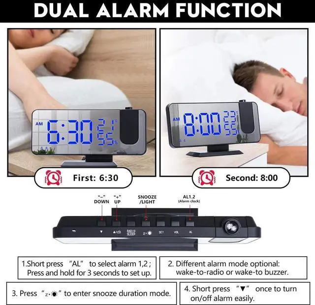180° Projection Alarm Clocks for Bedrooms Perfect projecting alarm clocks for bedrooms ceiling, this 180° rotatable projection clocks with focus control ring projected a clear time on your wall. Whenever you wake up, the time comes into your eyes. And our projector alarm clock for bedroom equipped with a high sensitivity sensor which can adjust the display brightness, it will not disturb you or your kids sleeping.