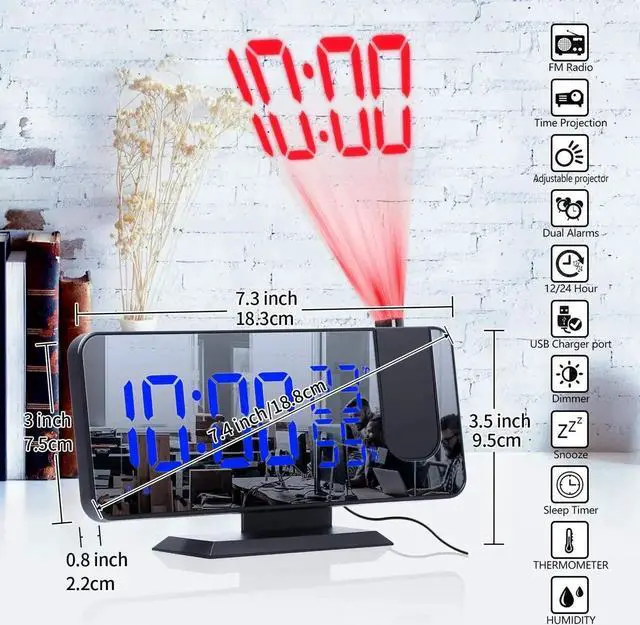 7.3" Large LED Display & Mirror ScreenThe alarm clock projector is 7.3 '' large enough, you can see the time clearly from the other side of the room even for short-sighted or elders. And this screen not only have an advanced appearance, but also can be used as a mirror. Good-looking and practical.