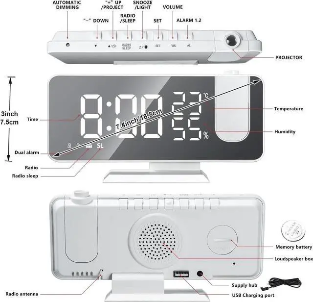 7.3" Large LED Display & Mirror ScreenThe alarm clock projector is 7.3 '' large enough, you can see the time clearly from the other side of the room even for short-sighted or elders. And this screen not only have an advanced appearance, but also can be used as a mirror. Good-looking and practical.
