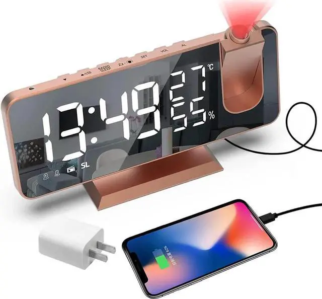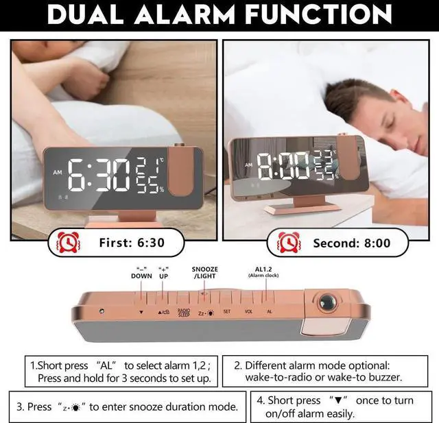 180° Projection Alarm Clocks for Bedrooms Perfect projecting alarm clocks for bedrooms ceiling, this 180° rotatable projection clocks with focus control ring projected a clear time on your wall. Whenever you wake up, the time comes into your eyes. And our projector alarm clock for bedroom equipped with a high sensitivity sensor which can adjust the display brightness, it will not disturb you or your kids sleeping.