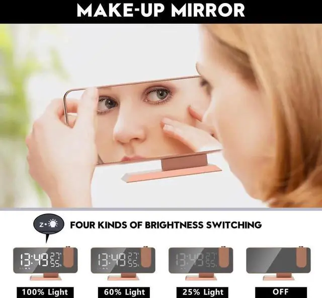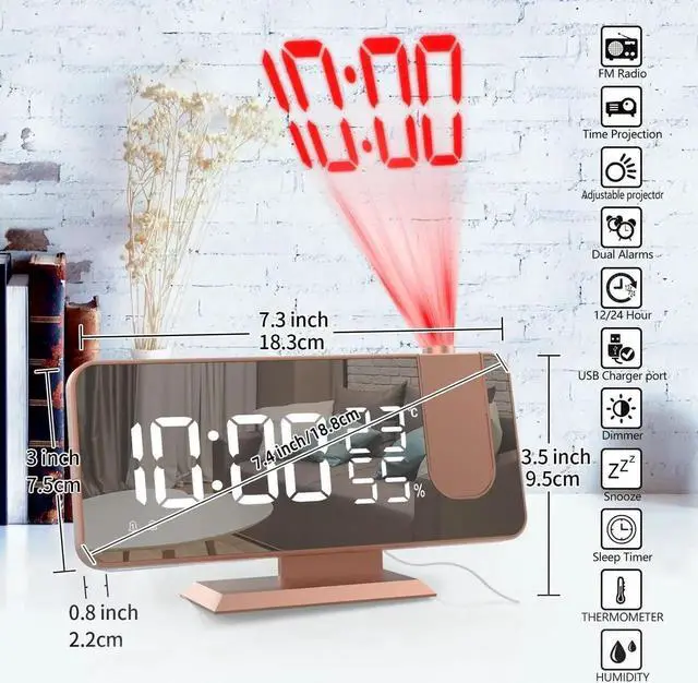 7.3" Large LED Display & Mirror ScreenThe alarm clock projector is 7.3 '' large enough, you can see the time clearly from the other side of the room even for short-sighted or elders. And this screen not only have an advanced appearance, but also can be used as a mirror. Good-looking and practical.