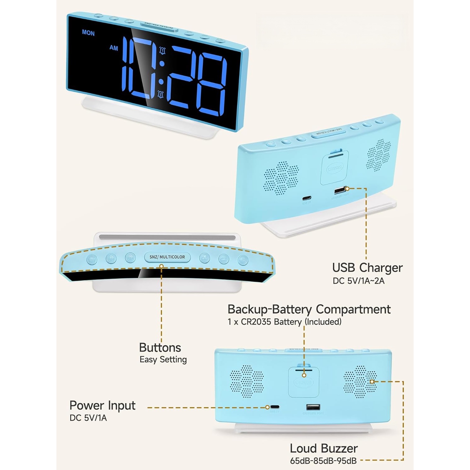 Loud Alarm Clock: Adjustable volume up to 105db with 3 levels, dual alarms, and a 10-minute ringer duration,ok to wake up for really heavy sleepers,adults,teens,kids