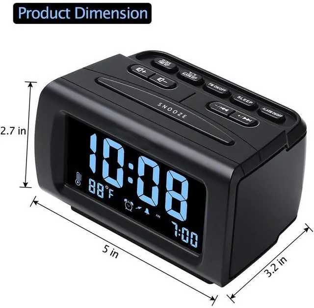 Electric Digital Alarm Clock with Full Range Dimmer for Bedroom: 4 Inches large LCD screen with eye easy catch blue number display, time and clock display are easy to read at a glance. 100%-0% completely adjustable display brightness for comfortable viewing. 12 or 24hr switch, Indoor temperature ( or ) Display.