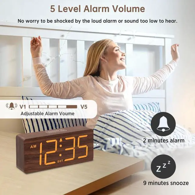 6 Dimmable Brightness Level: wooden bedside clock can be easily set with adjustable dimmer for different situation of using, dark enough for sleep and bright enough to watch in the day.
