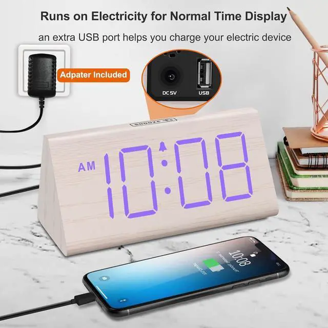 Plug in Alarm Clock with USB Charger: the bedside clock runs on electricity for normal time display and the AC adapter is supplied. A handy USB Charging Port helps you charge your smart devices and other gadgets without looking for your adapter and other outlet.
