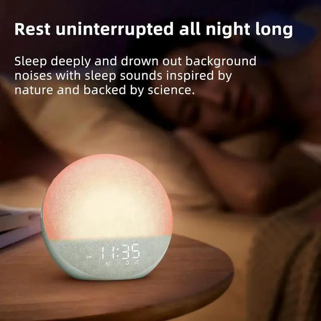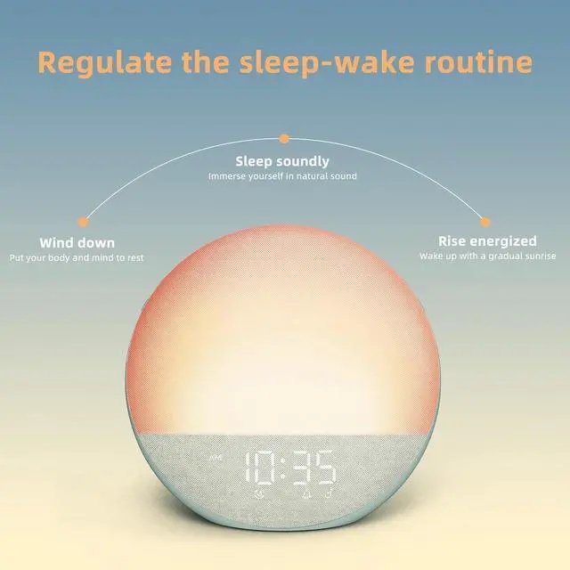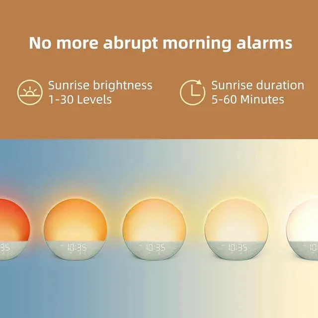 Gentle Wake Up with Sunrise Alarm Clock: The sunrise simulation gradually brightens over a customizable 5-60 minutes before your set alarm time, aligning with your circadian rhythm for a peaceful, stress-free start to your day.