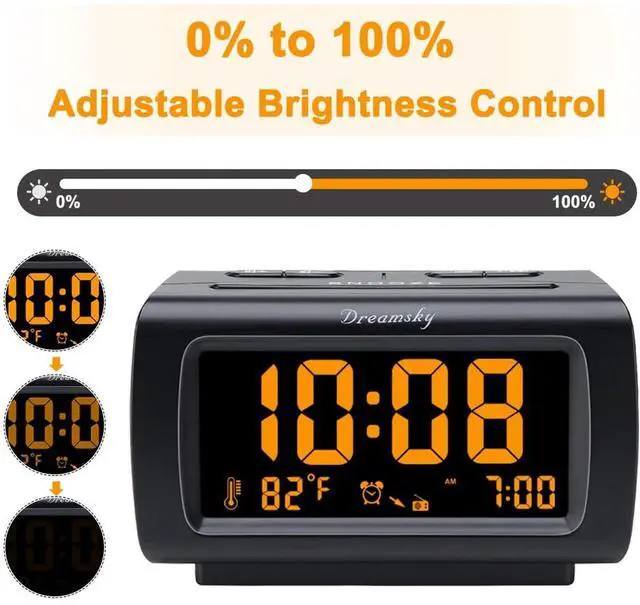 Electric Digital Alarm Clock with Full Range Dimmer: 4 Inches large LCD screen with eye easy catch orange number display, time and content are easy to read at a glance. 100%-0% completely adjustable display brightness for comfortable viewing. 12 or 24hr switch, Indoor temperature ( or ) Display.
