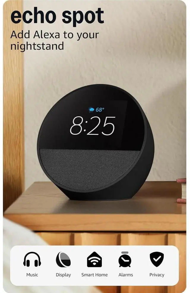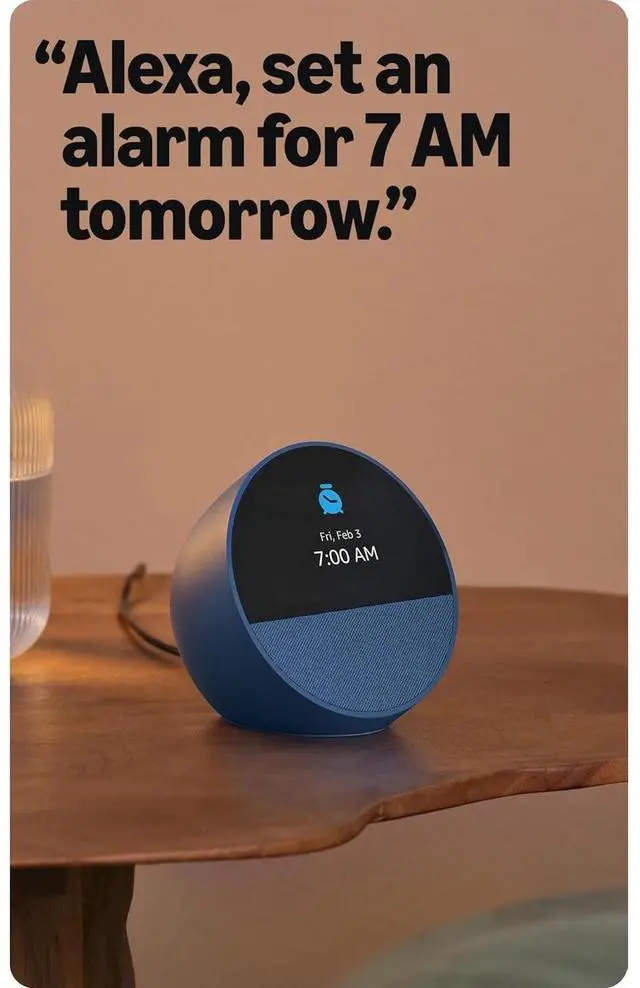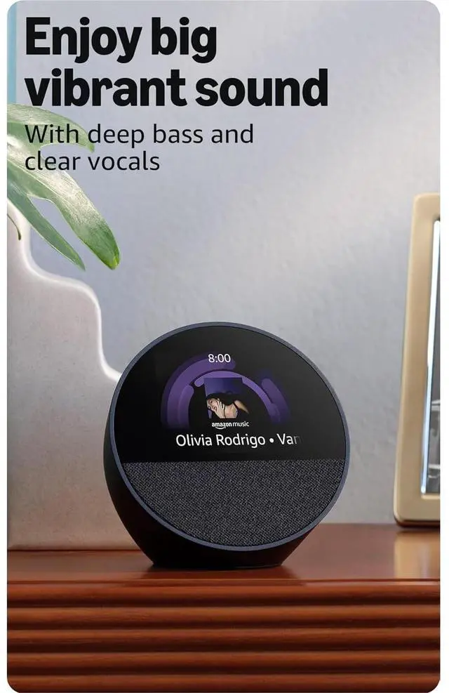 MEET ECHO SPOT - A sleek smart alarm clock with Alexa and big vibrant sound. Ready to help you wake up, wind down, and so much more.
