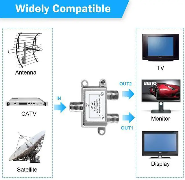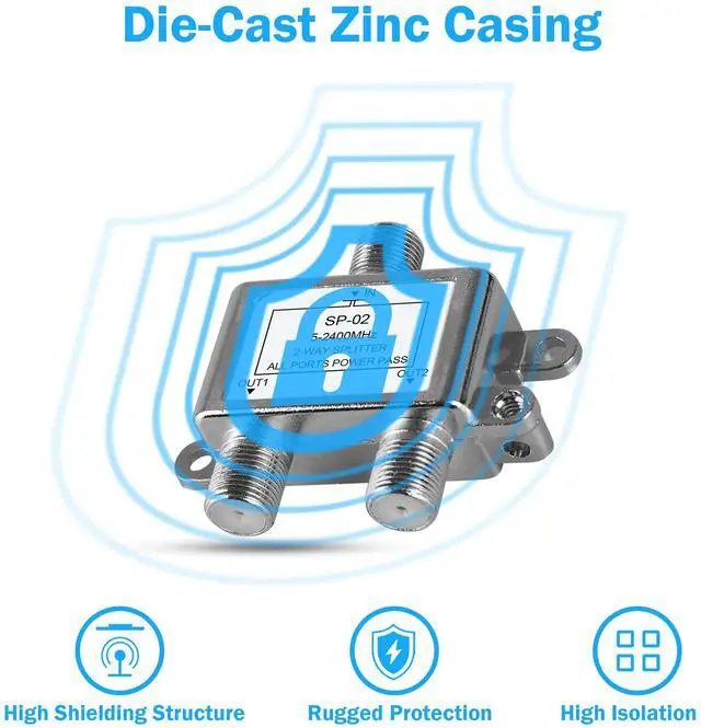 - [LOW SIGNAL LOSS]The frequency range of this moca splitter supports up to 5-2400MHz (2.4GHz), and internal circuit board for better reliability/durability. High shielding structure with low insertion loss, high return loss and isolation for better performance on TV, satellite and all other devices signal. Between 1750 and 2400MHz there is low signal loss of only 4.5db on each output port improving performance and speeds.