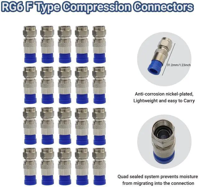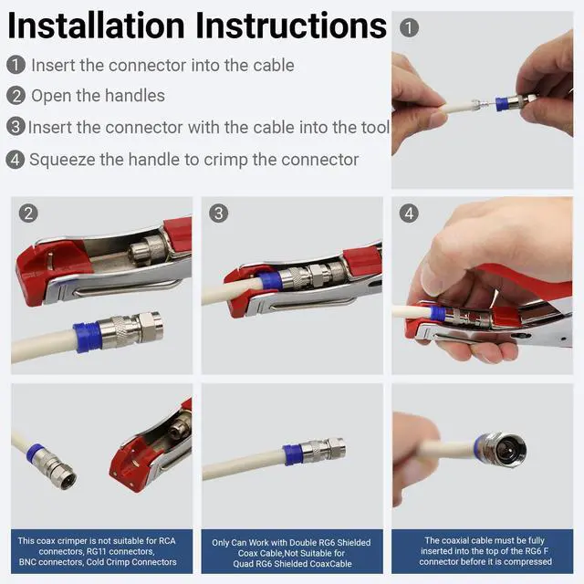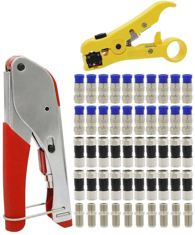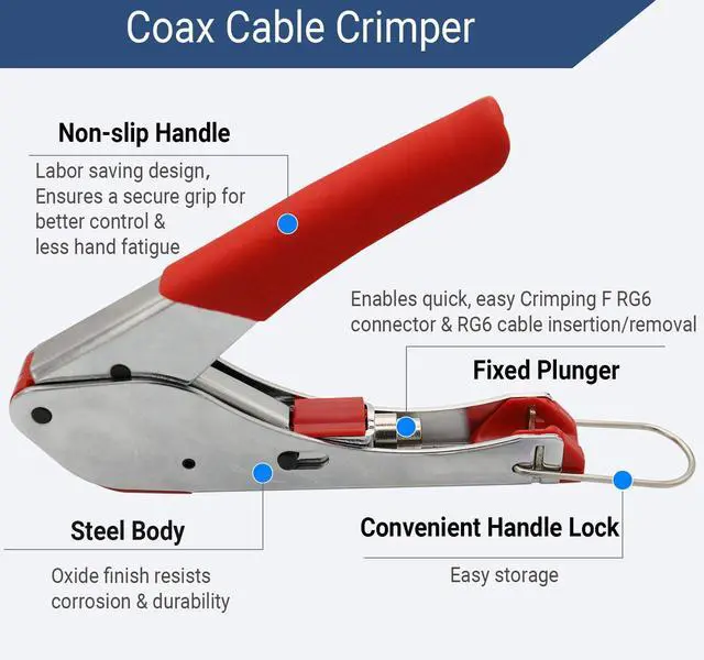 Compact compression crimper is an advanced DIY tool for fast, reliable F-connector installation that provides fast insertion and removal of cable and connector.