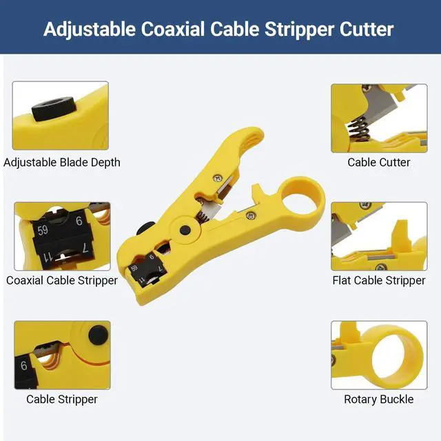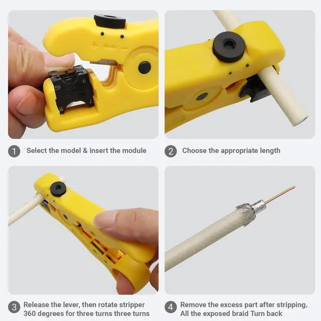 It works with RG7/11/213/8 and RG59/6/6 Quad cables and quickly removes cable jacket and dielectric.
