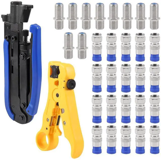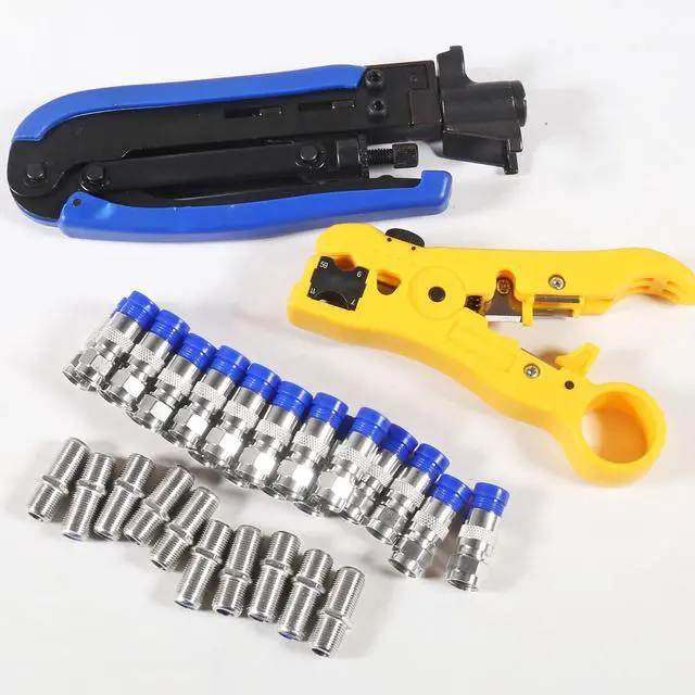 The crimping tool, an adjustable cable stripper, and F-type rg6, rg59, rg11 and compress 75-5-7 kinds of metric and Imperial f connectors. this coax cable repair kit provide a comprehensive solution for cable repairs and installations