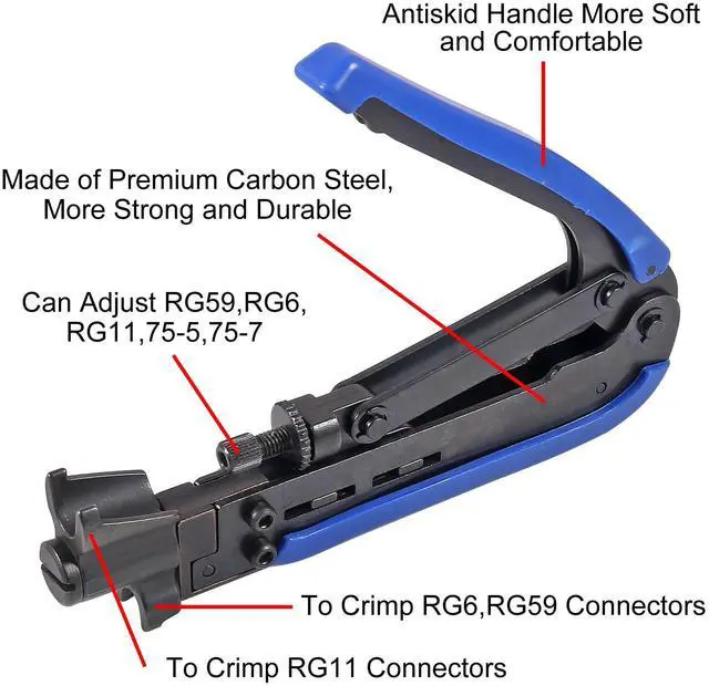 The coaxial cable crimper designed for RG59 and RG6 cables, ensures a secure and reliable connection, making it ideal for both indoor and outdoor use. Perfect for coaxial cable installations and repairs.Whether installing satellite TV, CCTV, moving cable TV and modems, or wiring a new house, the coax cable crimper kit meets all your needs, providing a versatile solution for various applications