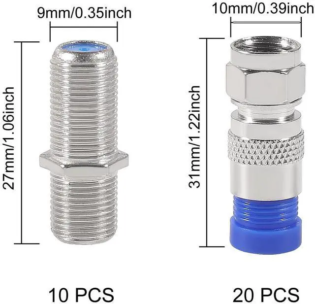 30Pcs F Type RG6 Compression Connectors Coaxial Cable Crimper Kit with Wire Stripper Repair Tool Compatible with RG59, RG6, RG11 Compatible Adjustable Tool for Satellite TV, Home Use