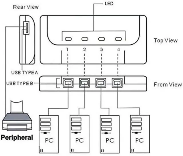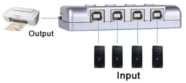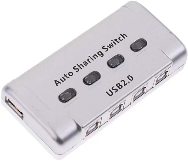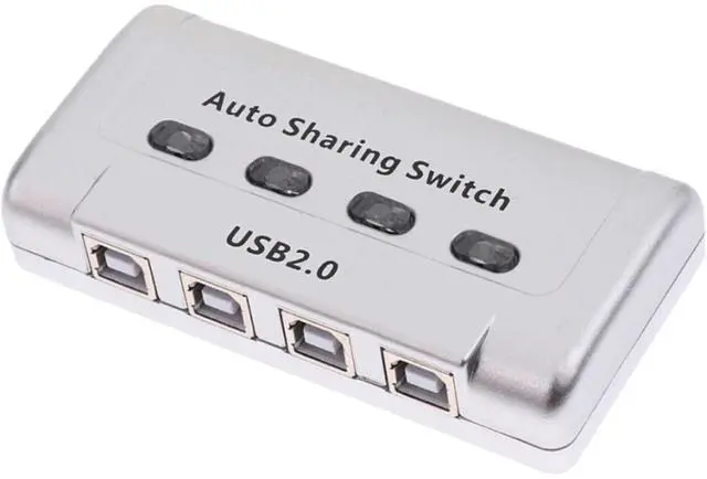 Sanoxy 4-port USB 2.0 Printer Switch that allows up to 4 computers to share the use of a single USB peripheral device (such as a printer, scanner, mass storage drive, etc.) on a one-at-a-time basis. Home, Personal Office, Education use. USB 2.0 compliant. Share your USB devices between four computers with the 4 Port USB 2.0 Auto Selector Switch. This easy-to-use switch box allows you to switch between computers with the push of a button, or you can use the Auto Switch function to automatically switch to the computer that is currently active. The switch box is compatible with Windows and Mac, and it supports transfer rates up to 480 Mbps.