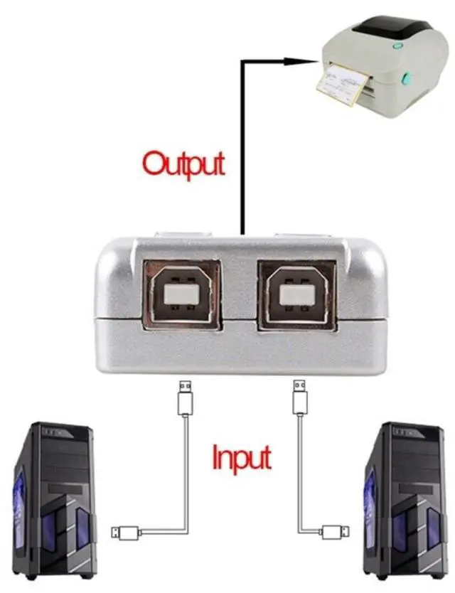 Sanoxy 2-port USB 2.0 Printer Switch that allows up to 2 computers to share the use of a single USB peripheral device (such as a printer, scanner, mass storage drive, etc.) on a one-at-a-time basis. Home, Personal Office, Education use. USB 2.0 compliant. The USB 2.0 Auto Sharing Switch 2 Port HUB Adapter Switcher is a convenient way to share your USB devices between two computers. Simply plug in the switch box and connect your USB devices, and the switch box will automatically switch between computers as needed. The switch box is compatible with Windows, Mac OS X, Linux, and Chrome OS, and it supports USB 2.0 and USB 1.1 devices.