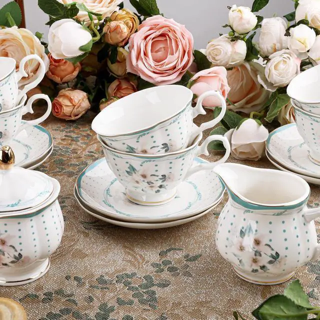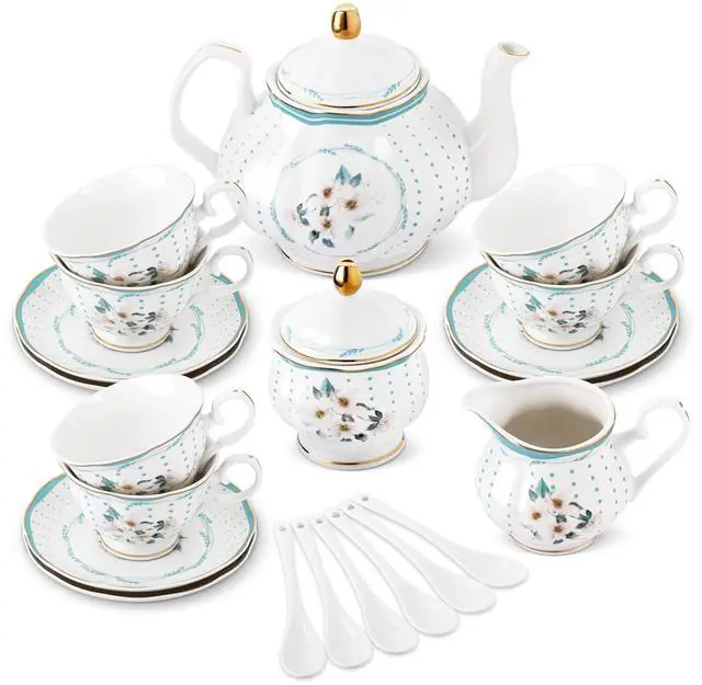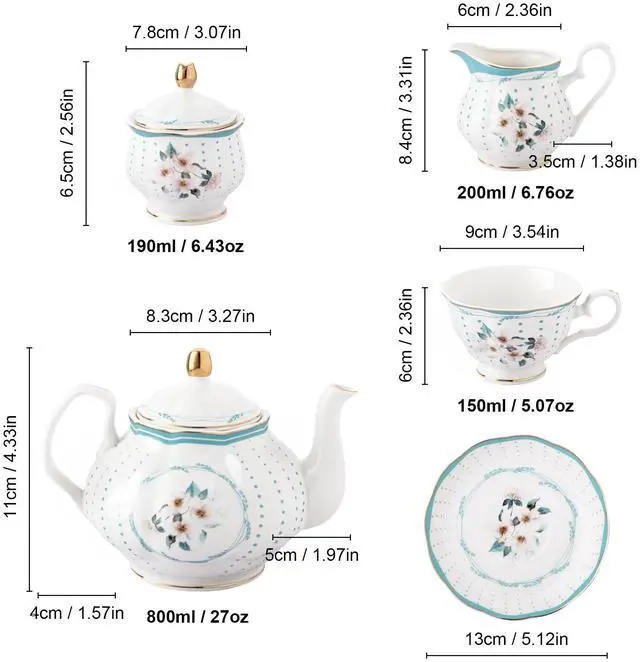 GUARANTEE: If you receive the product with broken, please take photos and contact us seller FangKuai. We will response and arrange free individual replacements or refund very soon PACKAGE: 1 x teapot, 6 x tea cup, 6 x saucer,6 x spoon,1 x Sugar Bowl,1 x Milk Jug, 1 x Metal Holder. The ceramic product are packed with foam and shockproof box to prevent broken in the long shipping way TEA SET CAPACITY & SIZE: Teapot: 30.43 oz, 8.66"x 5.7"x 3.74"; Small cup: 6.08 oz, 4"x 2.67"; Sugar bowl: 6.08 oz, 4"x 3"(Height with lid); Milk jug: 6.76 oz, 3"x 3"; Saucer diameter: 5"; Holder: 14"x 11"x 7.7". Please confirm the specification before order MATERIAL& PLACE OF ORIGIN: Porcelain,safe and healthy. New bone china, mineral-based material, durable and animal-friendly. Chaozhou,China. Long history. Today, Chaozhou has been awarded the title of "China Porcelain Capital" and the city has a considerable scale of ceramic production APPLICATIONS: Household, office, collection, tea party, etc. It's a pretty gift for holiday, weddding, birthday, Christmas, thanksgiving and anniversary. Create happy time with fanquare tea sets