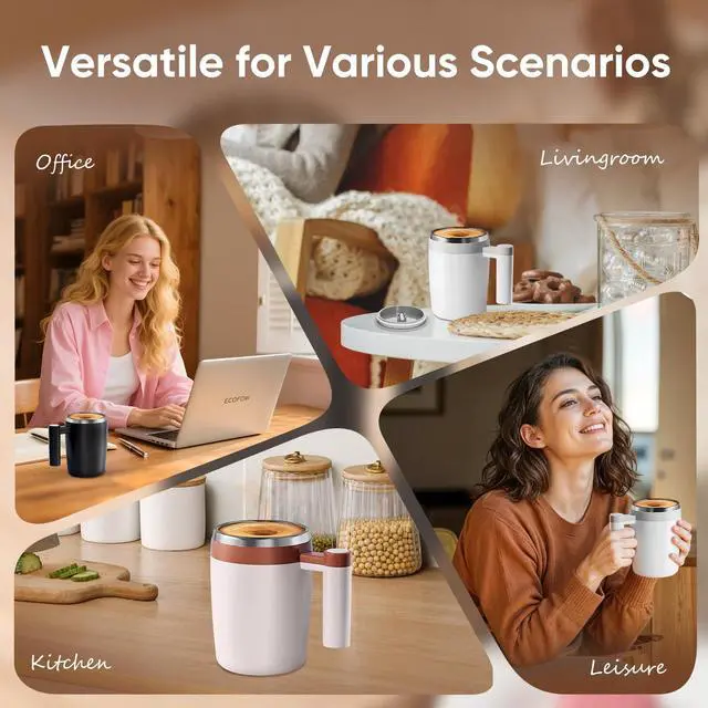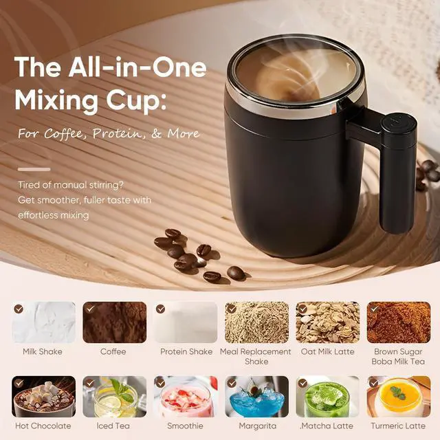 Yes! The self-stirring system uses a strong magnetic stir bar to smoothly blend thick liquids like protein powder, hot cocoa, or milk without clumps. For best results, press the button for 10–15 seconds and let it create a perfect swirl.