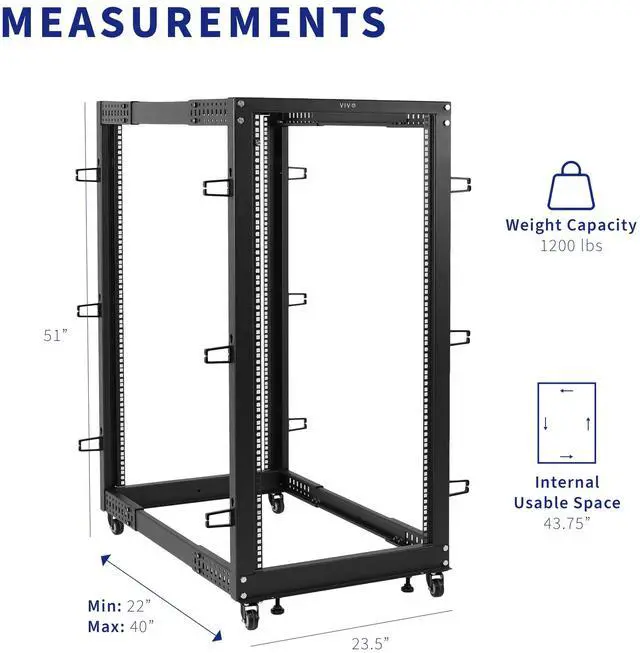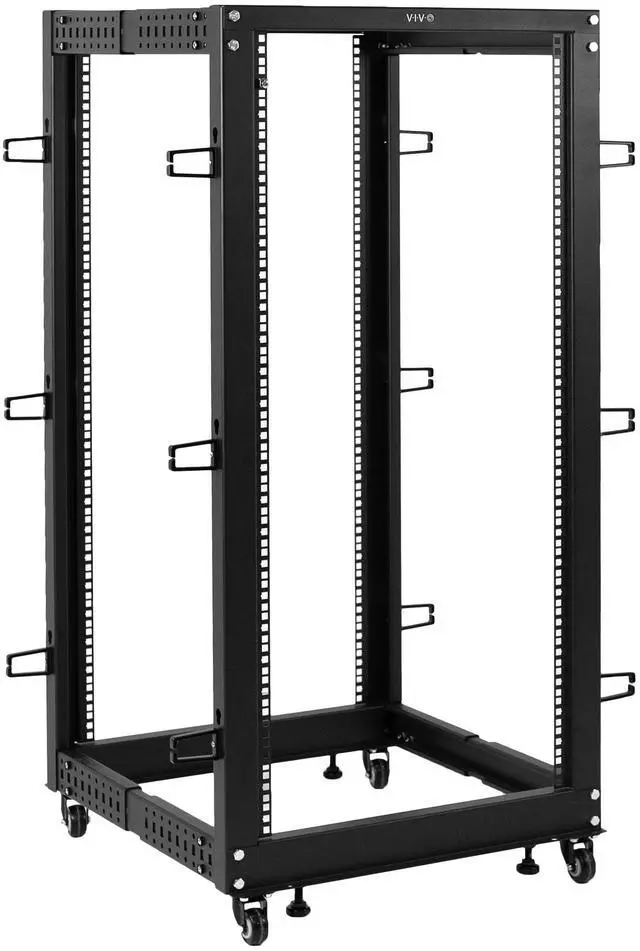 Looking for a way to organize your servers and networking equipment? Try our mobile storage solution, the Black 25U Server Rack (CART-SR25U) from VIVO! This 4-post open frame server cart gives you plenty of options with adjustable depth from 22 to 40. Easy-to-read markings are included for depth increments so you can find your desired settings. Loading capacity is 1200 lbs thanks to the solid steel construction, making this solution last! The universal design is compatible with most rack equipment, and 4 caster wheels are provided to create smooth mobility on a variety of floor types. Optional leveling feet are also included to make the cart stationary if desired.