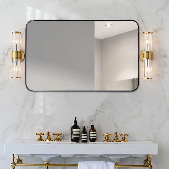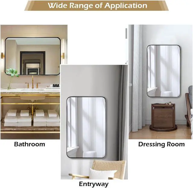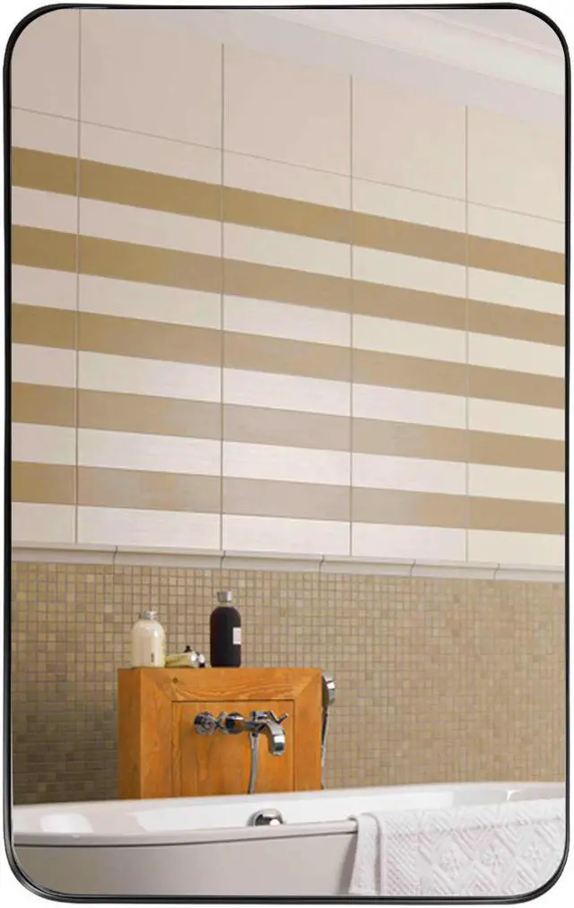 Are you looking for a practical and beautiful bathroom wall mirror for your home now? This rectangularbathroom mirror combines wonderful quality with elaborate appearance so ithas a long lifespan. The frame of this modern mirror is made of premium power coated metal which can acclimatize to humidity. Large size mirror with high resolution can clearly show your beautiful face and fine clothes. Classic color and rounded corners make our mirror a perfect solution for adding beauty and light to your home. This wall mirror can be placed in the bathroom, living room, hallway and even used as your makeup mirror. Equipped with the sturdy keyholes on the back, the wall mirror can be hanging firmly on the wall vertically or horizontally.