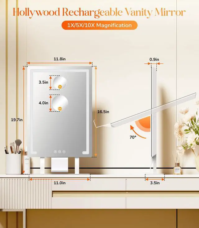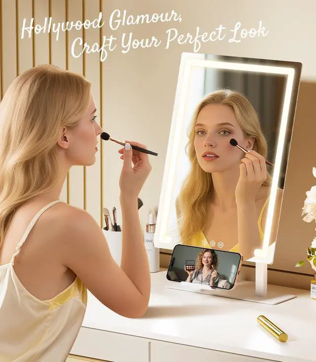 - [Exquisite Material & Phone Holder]This Hollywood LED Makeup Mirror with Lights is made of high quality ABS material and high definition mirror, with a solid base and exquisite textured mirror back, showing the design. The specially designed cell phone holder can hold your phone securely, allowing you to watch beauty tutorials while applying makeup, realizing the convenient experience of learning while applying makeup