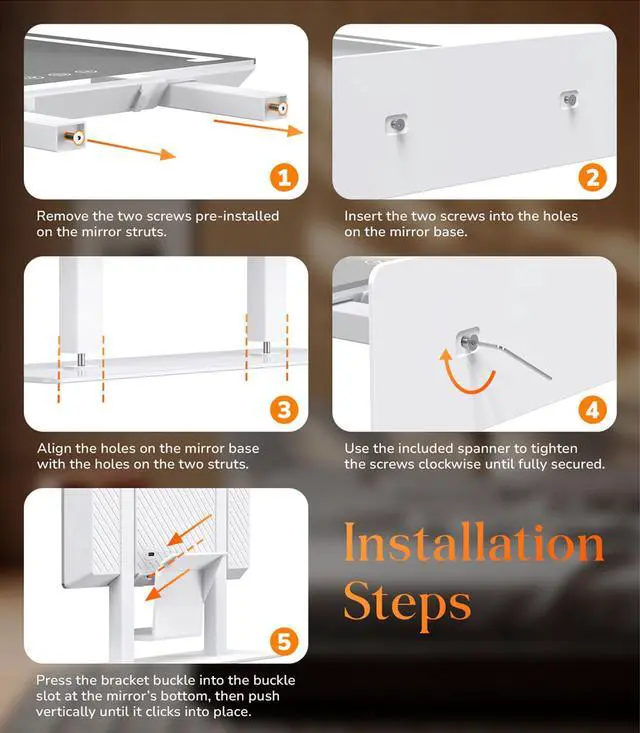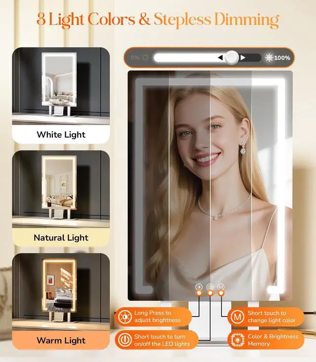 - [Smart Touch & Memory Function]This Desktop Vanity Mirror adopts advanced touch control technology, Easily adjust brightness and switch lighting modes with touch controls. As well as it has an intelligent memory function that automatically saves the brightness and light effect settings you last used. Instantly restoring your preferred light for a personalized, hassle-free makeup routine every time