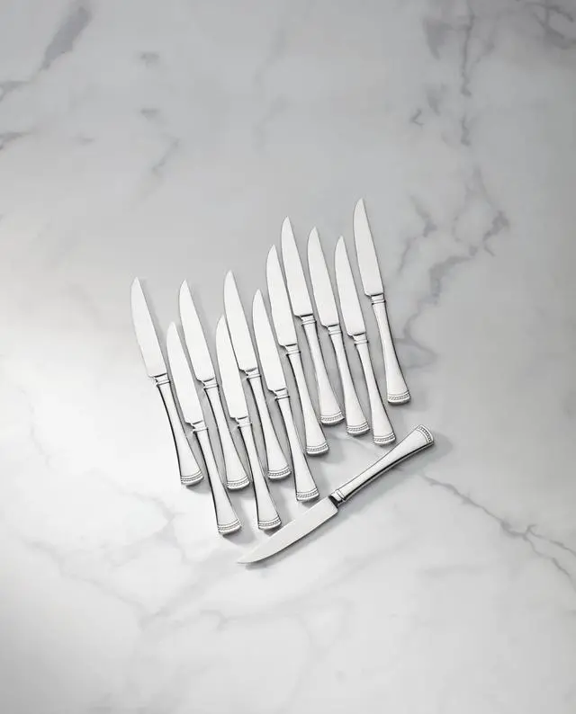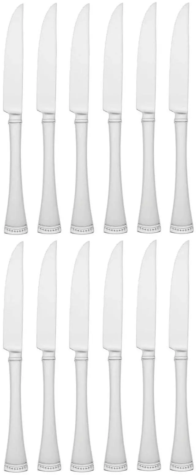 The Portola pattern features flared handles with a beaded channel at each base. Crafted from brilliant 18/10 stainless steel, this high-quality steak knife set is both durable and dishwasher safe, making it ideal for everyday use. This set of twelve knives is perfect for both casual and formal occasions.