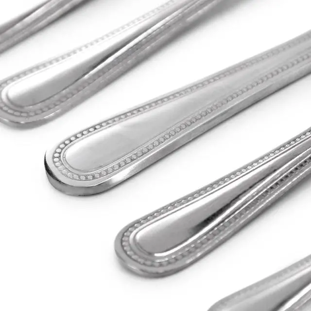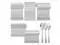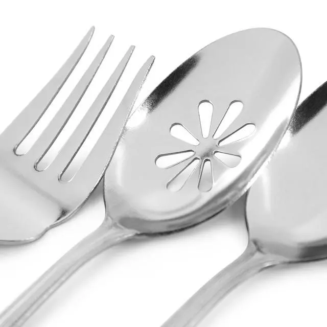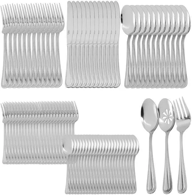 This set includes 12 dinner forks, 12 dinner spoons, 12 dinner knives, 24 salad forks, 24 teaspoons, 1 slotted serving spoon, 1 solid serving spoon, and 1 serving fork. Get all the utensils you need for everyday dining or buffet style serving in this one 87 piece set!