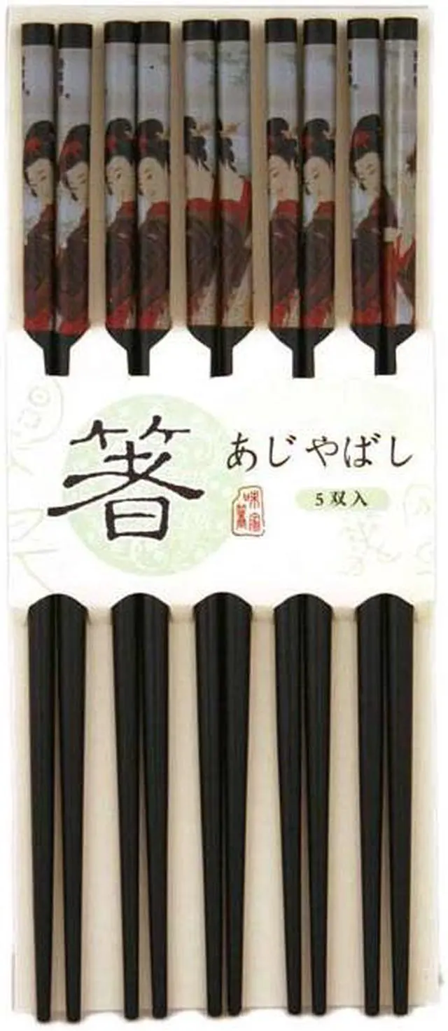 These chopsticks are a beautiful, functional and ecologically sound addition to any kitchen. Each set includes 5 pairs of chopsticks with a beautiful Japanese geisha design. Each chopstick can be used as a hair stick too. Attractive and functional chopsticks constructed from bamboo which is an ecologically green alternative to wood. Bamboo is strong, dense and versatile. Pack includes 5 pair of 10" long bamboo chopsticks