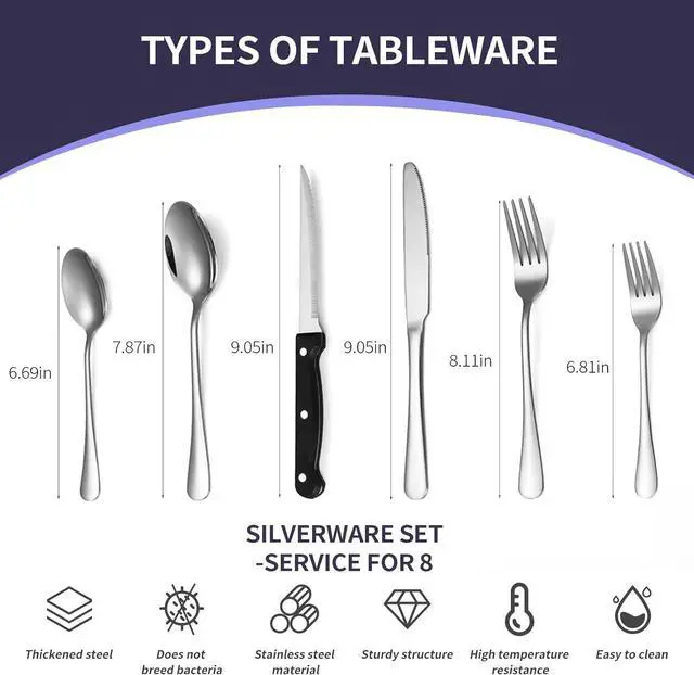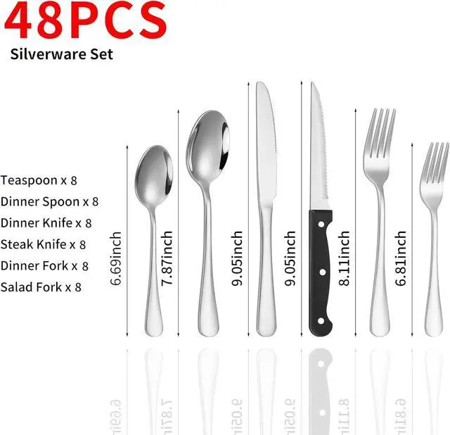 This silver ware set contains: 8 steak knives, 8 dinner knives, 8 dinner forks, 8salad forks, 8 dinner spoons and 8 teaspoons. Perfect black stainless steel silverware for home, restaurant, family daily use, entertaining, wedding, outdoor dining, camping, dinner party, holiday usage and festival gathering. The silverware set black color is dark and shiny.