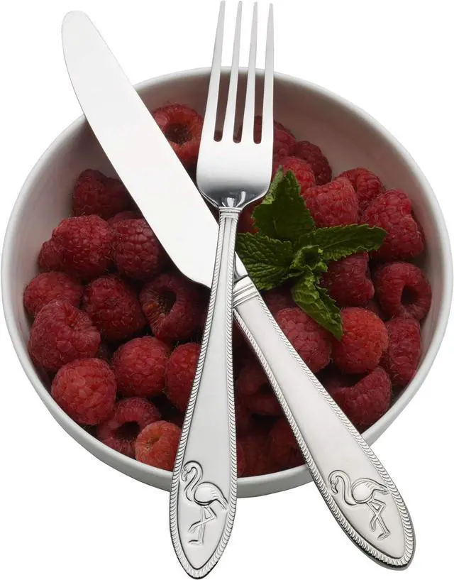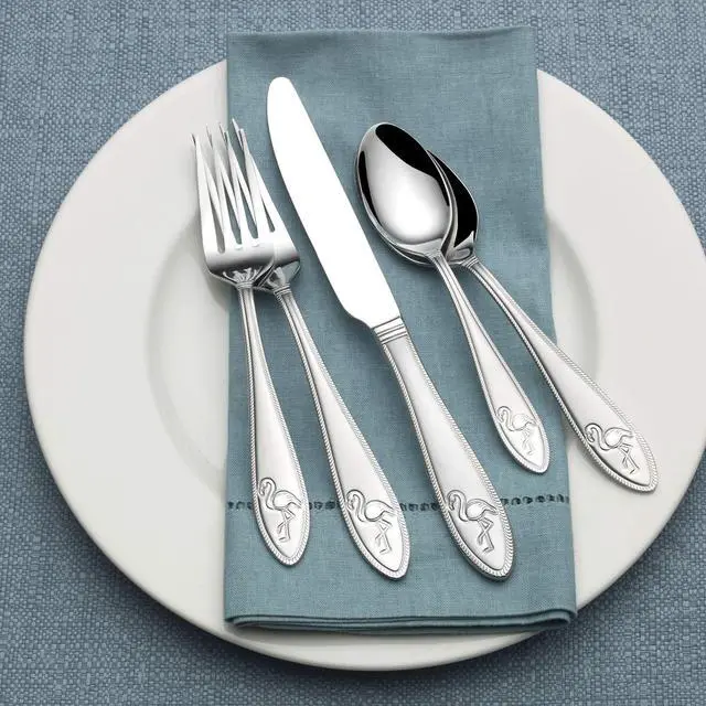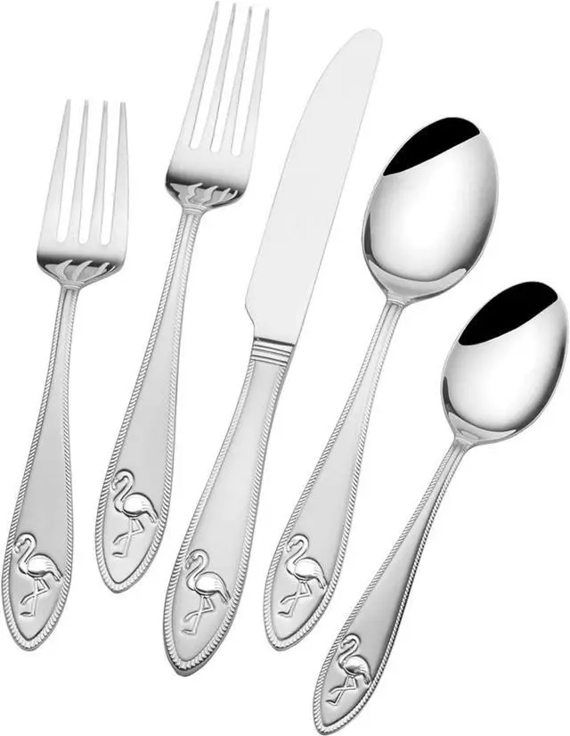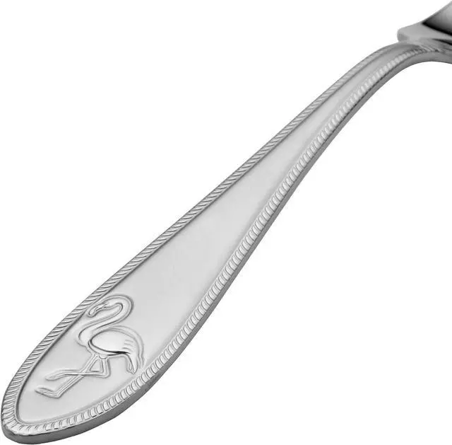 TROPICAL THEME: Flamingo flatware features a teardrop handle framed with a subtle bead design and adorned with a flamingo accent at the tip