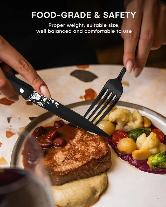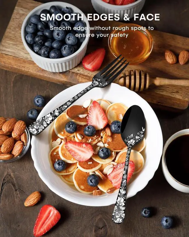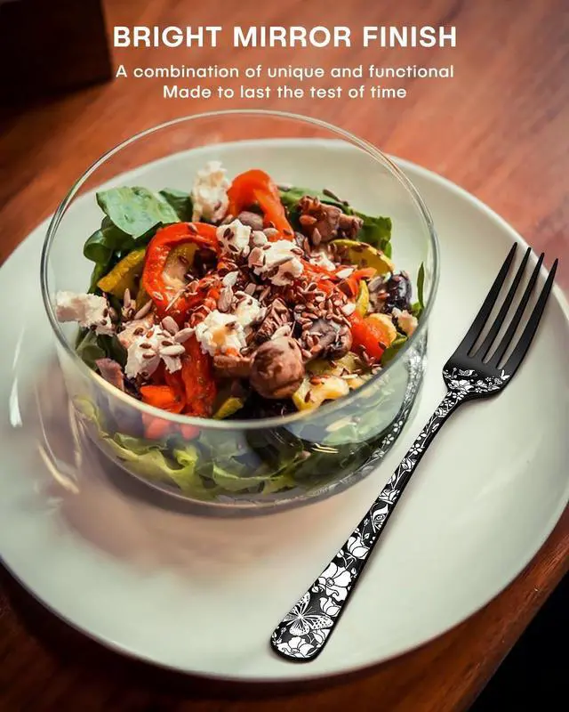 UNIQUE AND ELEGANT DESIGN - Have you ever been using the same, probably mismatched, silverware set for years? It' s time to upgrade your outdated utensil set and welcome a more modern cutlery. Our heavy-duty stainless steel silverware set is decorated with a beautiful laser print of butterflies with flowers, stylish shape with a black finish adds a touch of elegant and luxurious dining sense to your table setting.