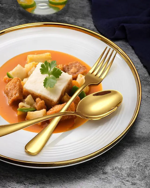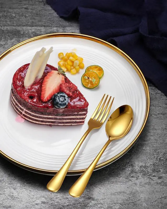 PREMIUM QUALITY AND DURABILITY: Made of premium food-grade stainless steel, our gold silverware set is built to last. Its sturdy and stable structure makes the knives, forks and spoons silverware less prone to bending and rusting, making it more durable and durable. Enjoy the benefits of a stunning and reliable dining set for years to come. It is the ideal choice for your tableware set.