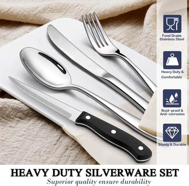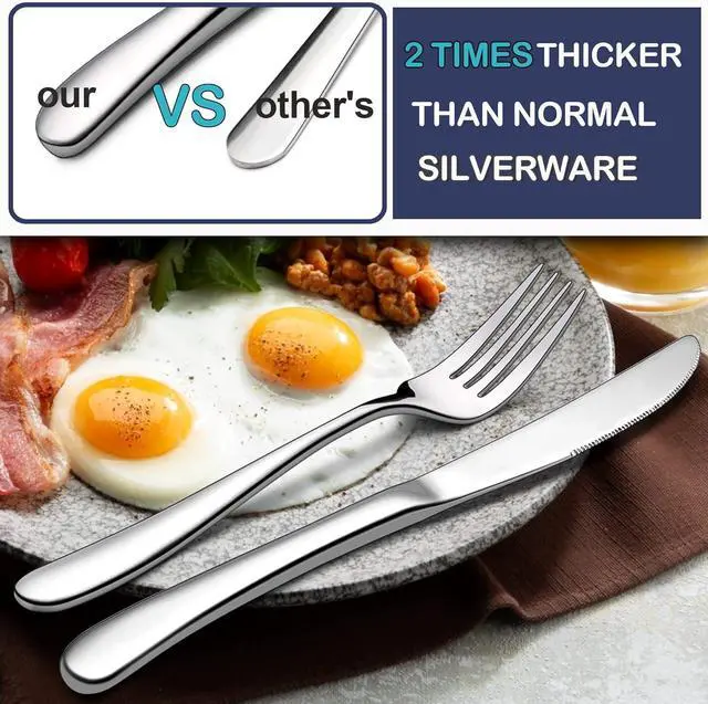 Heavy duty, this heavy flatware set has decent thickness which is 1.5 times thicker than normal flatware, solid construction would never bend for daily use, substantial weight provide well balanced and great hand feels