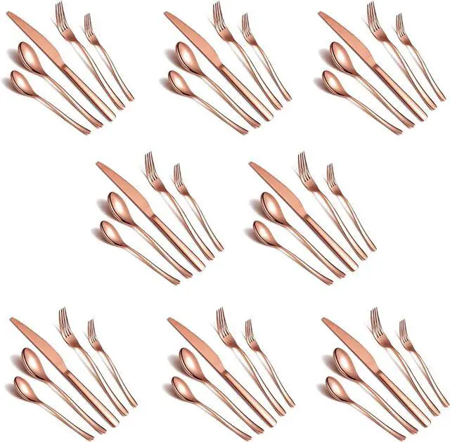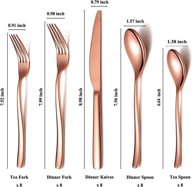 Piece Copper Silverware Set: Include Dinner Knives x 8, Dinner Fork x 8, Dinner Spoon x 8, Teaspoon x 8, SaladFork x 8.