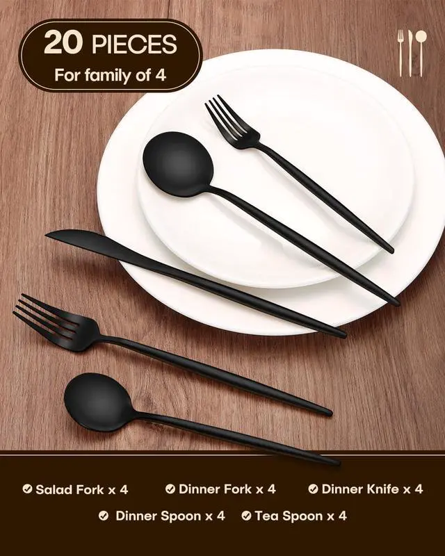 20PCS BLACK FLATWARE SET FOR 4 - Including 4 dinner knives, 4 dinner forks, 4 dinner spoons, 4 salad forks, and 4 teaspoons. Perfect for any occasion, from everyday family meals to joyous gatherings and formal banquets. Create cherished memories during candlelight dinners, celebrate holidays like Thanksgiving with elegance, or elevate your BBQs and weddings to a new level of sophistication.