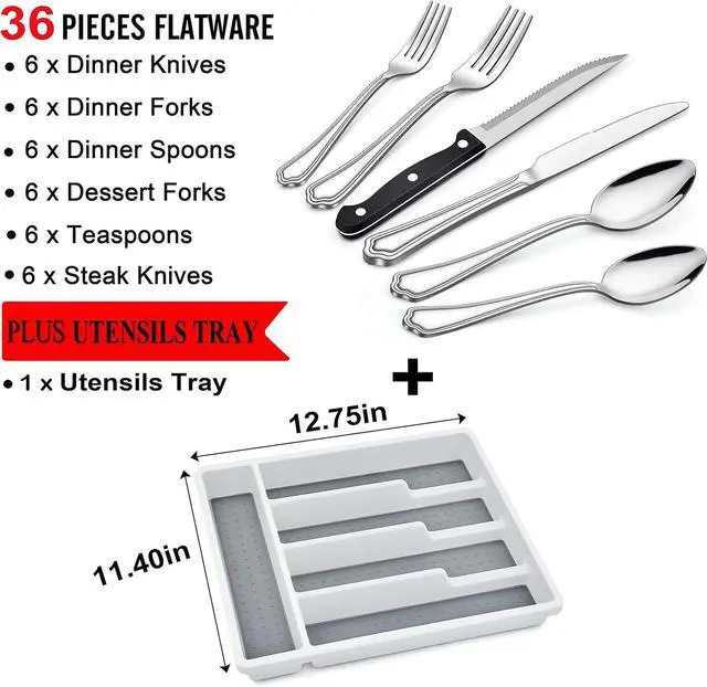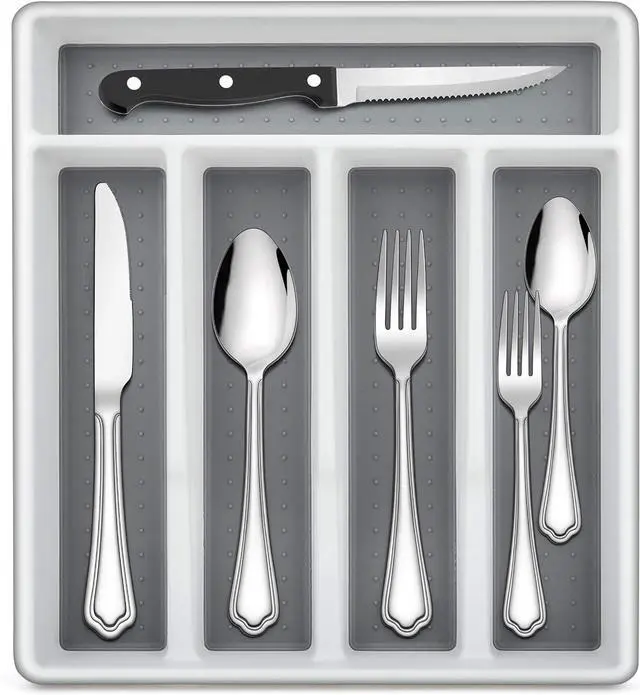 Attached steak knives and flatware organizer, the knives set of 6 with sharp serrated edge, which allow you to slice through any types food, ergonomic design with triple riveted handle for better grip, this utensil tray is made out of quality plastic, non-slip rubber feet and soft-grip lining makes it does not move in the drawer, 5 compartments provide ample space for cutlery storage