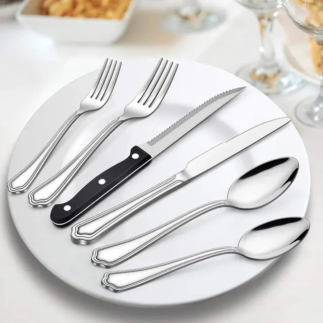 Durable construction, 36pc flatware set with steak knives are made out of high quality stainless steel, which ensures healthy and durability, rust resistant, sturdy structure for long time usage, absolutely not flimsy and never worry about bending
