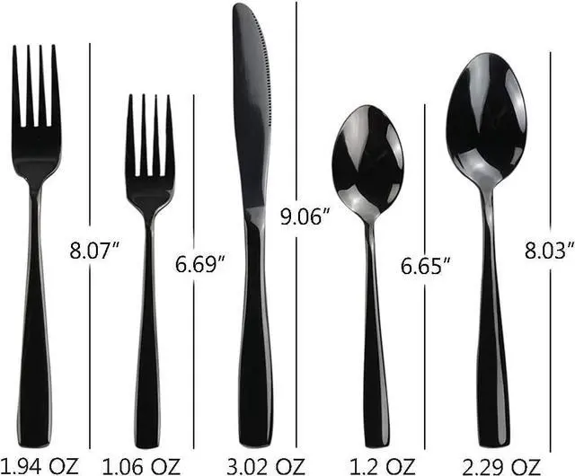 Set includes 12-piece 8.03 " dinner spoons, 12-piece 8.07 " dinner forks, 12-piece 9.06 " dinner knife, 12-piece 6.65 " dessert spoon, 12-pieces 6.69 " dessert forks