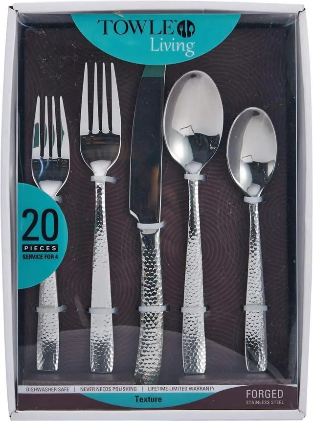 20-piece set includes (4) each of: dinner fork, salad fork, dinner knife, dinner spoon and teaspoon Superior stainless steel Never needs polishing Dishwasher safe