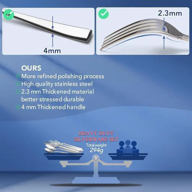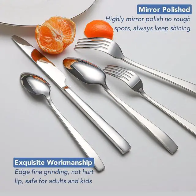Excellent Workmanship SilverwareMultiple times of fine polishing gives EIUBUIE spoons and forks set elegant fine mirror finish, nice shine and bring a high-grade and modern metallic texture, smooth and no rough edges, very comfortable to use without hurting your mouth at all.