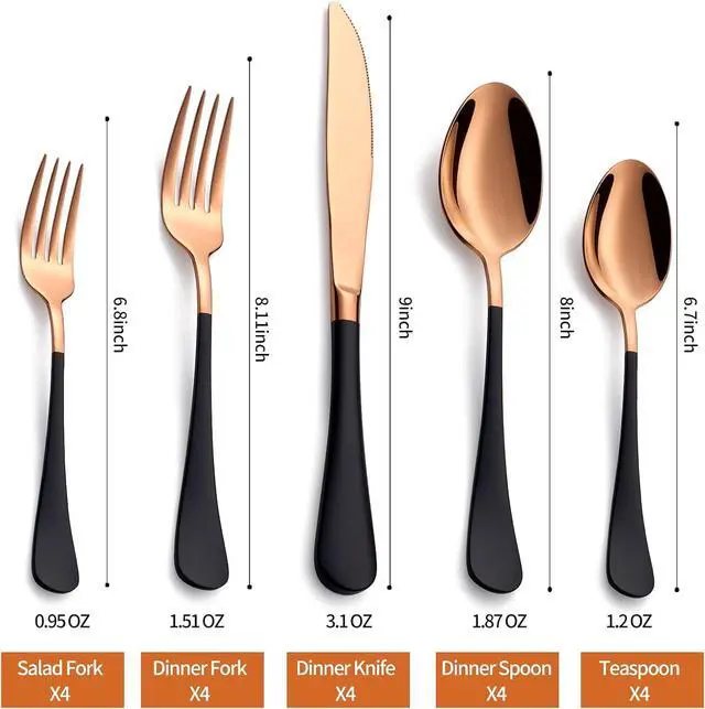 Durable 18/0 Stainless Steel Silverware Service for 4- The nice weight forged stainless-steel silverware set with polish gold surface, it offers eye-catching good looks, smooth polished surface made it more beautiful.