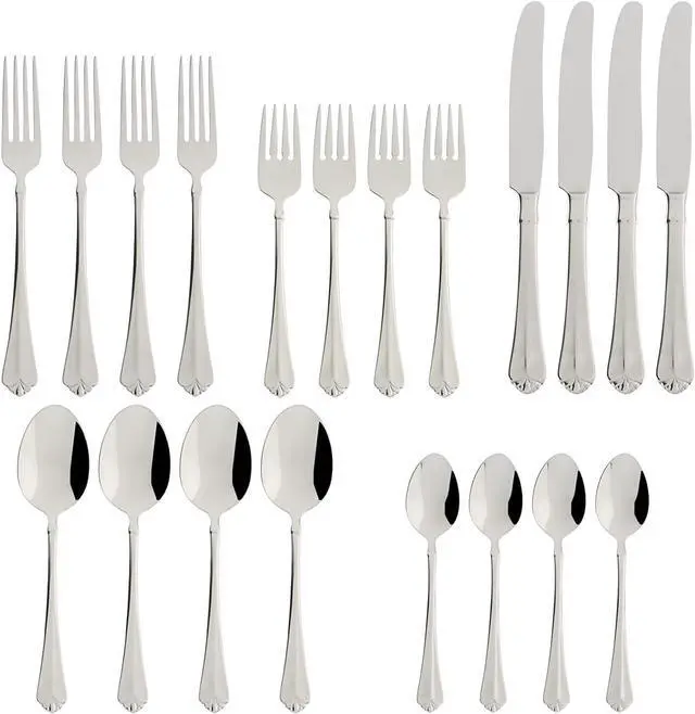 S IN THE BOX: Includes a 20-piece flatware set for 4 people. Each of the 4 flatware place settings includes a dinner fork, salad fork, dinner knife, dinner spoon, and teaspoon.