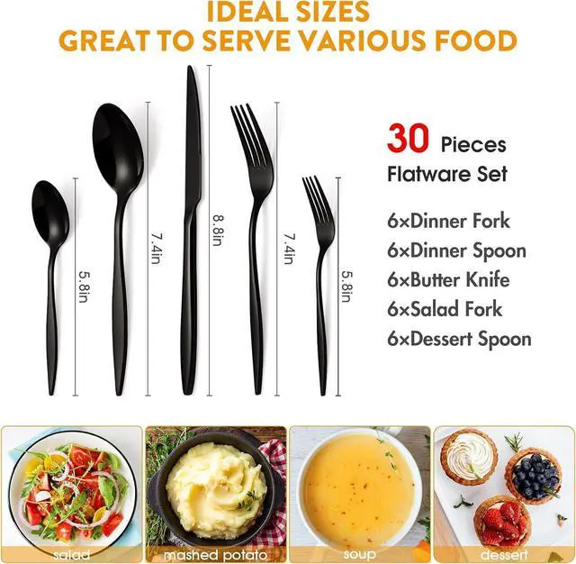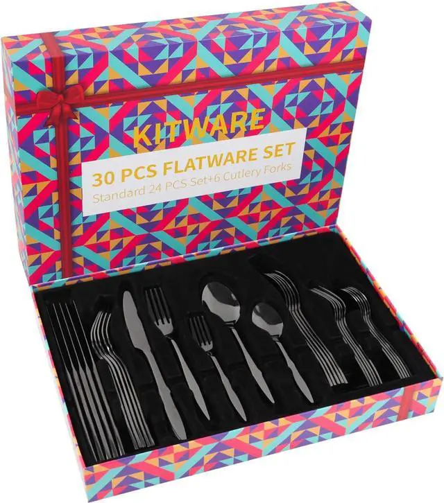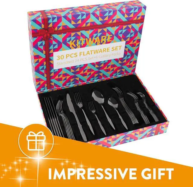 They' re the unicorns of silverware! --Set of 30 pcs kitchen cutlery set with gift box include standard 6 dinner forks, 6 dinner spoons, 6 serrated steak forks, plus 6 cutlery Forks. Ideal dinner utensil sets service for 6. Heavy duty spoons silverware for eating chowder, oatmeal, soup or cereal, wheat. And strong forks silverware for cake, salad, meat, Pork, dessert. You can also used them as home daily utensils, which are much more fun.