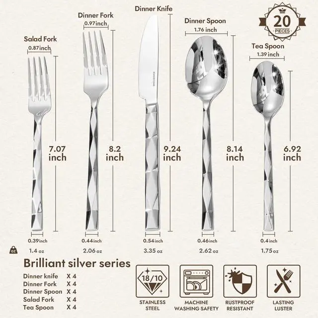 SILVERWARE SET INCLUDES: 20-piece flatware set includes 4 dinner knife ( 9.2 inch/ 3.4 oz), 4 dinner fork ( 8.3 inch/ 2.1 oz), 4 dinner spoon ( 8.2 inch/ 2.5 oz), 4 salad fork ( 7.1 inch/ 1.38 oz) and 4 teaspoon (7 inch/ 1.68 oz), service for 4