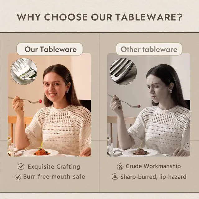 TOP WORKMANSHIP: This tableware use more than 10 times handcraft polishing instead of machine polishing to make the surface like a mirror. High-temperature forging technology enhances the hardness of the material and will not bend or deform.