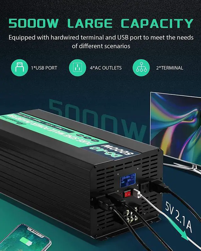 Converts 12V DC to AC 110V/120V household power with continuous 5000 watts output (10000 watts surge). Features with 4 AC outlets, one 2.1A USB port and 1 hardwired Terminal.
