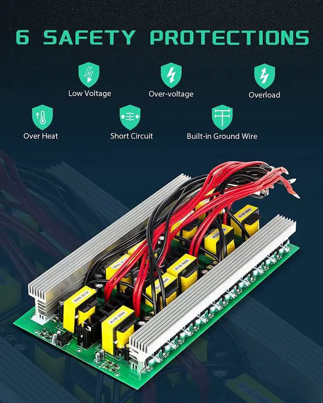 This 5000W inverter has passed FCC CE ROHS certification. Designed with low-voltage protection, over-voltage protection, overload protection, short circuit protection, overheat protection and built-in grounding design.